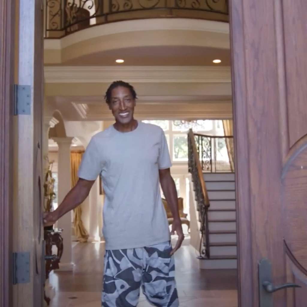 The tour starts in the dining room, and it’s very elegant! Pippen says he has a “lot of great memories at that table.”