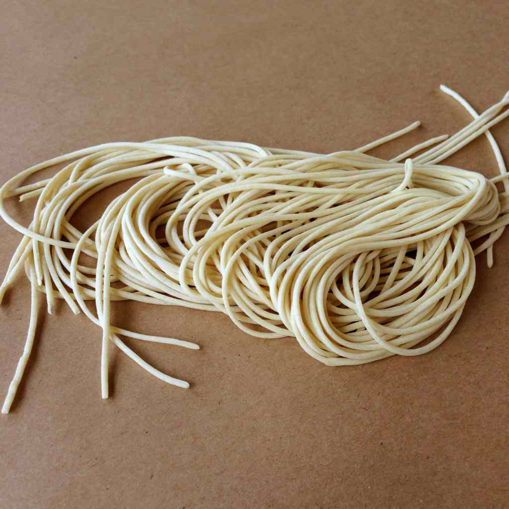- Cut the dough into four even pieces with a knife. Using a pasta machine, pass each piece through the rollers, starting with setting 1 and working through to setting 5. Coat the dough sheets well with potato starch to prevent sticking, and then pass noodles through the thin-width cutters. Dredge the noodles evenly with more potato starch.