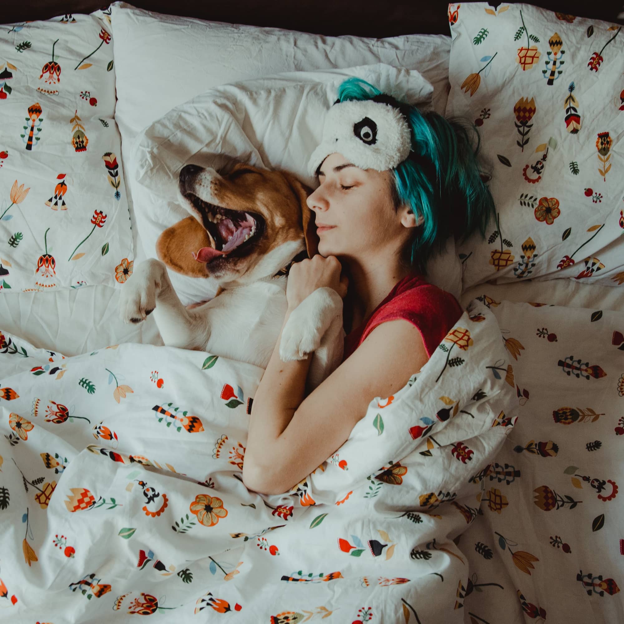 Additionally, Dr. Nascimento recommends restricting the area of the bed your pet is allowed to sleep in or only allowing your pet on a special pet blanket at the foot of the bed, so you have plenty of room to rest. She also says to make sure your dog has gone out for their nightly poop or pee so you don’t have any surprises. Otherwise, snuggle up and happy sleeping!