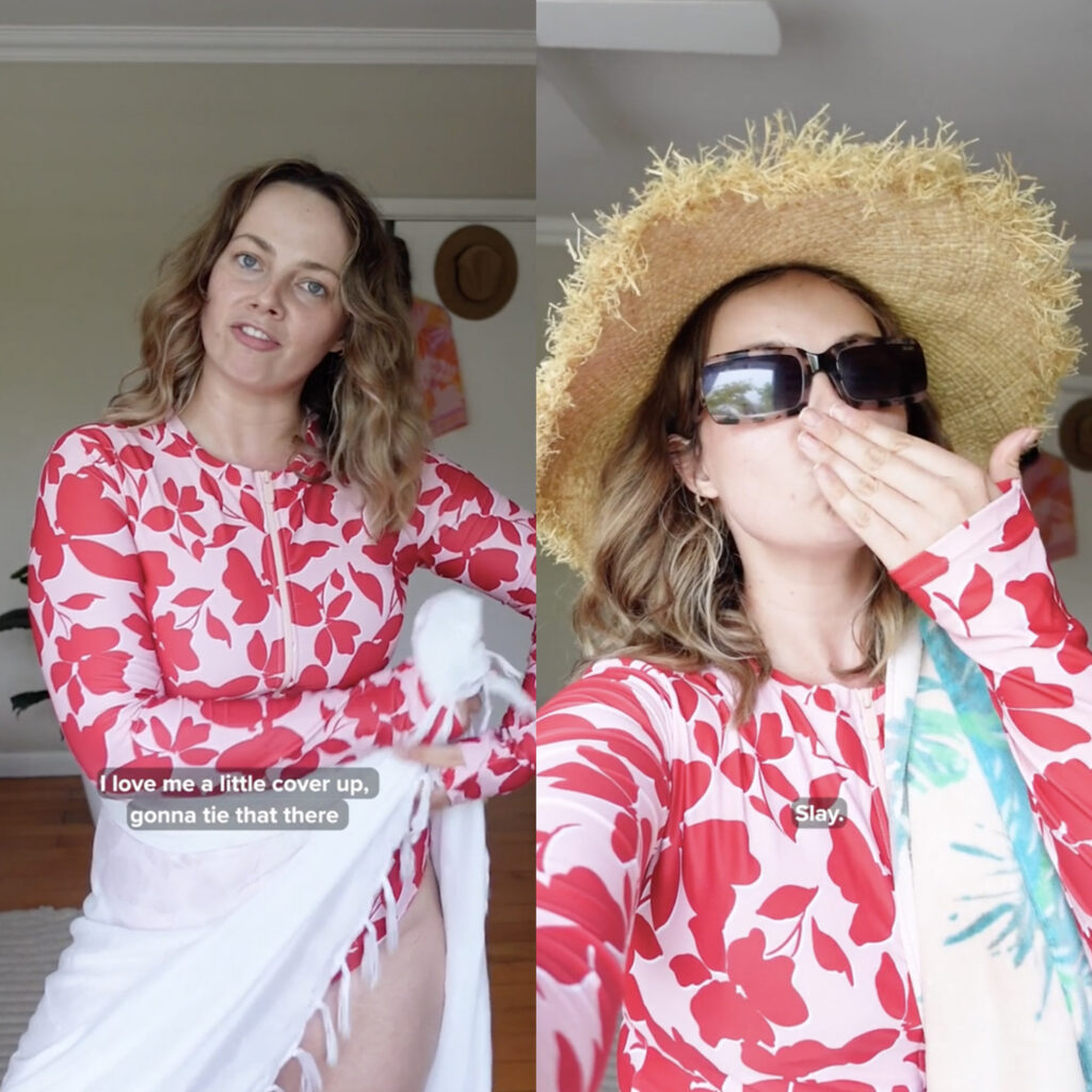 Her final look is the perfect ensemble for a dip — in the pool or the ocean. She started with a long-sleeved swimsuit in an eccentric pattern, in a pink hue that looked stunning against her natural skin-tone. Then, she layered the look with a solid white sarong. The piece added a little more to the silhouette of the look and she followed by applying sunscreen to her legs to further protect her skin. She completed the look with the adorable straw hat from look two, and of course a trusty pair of sunnies.