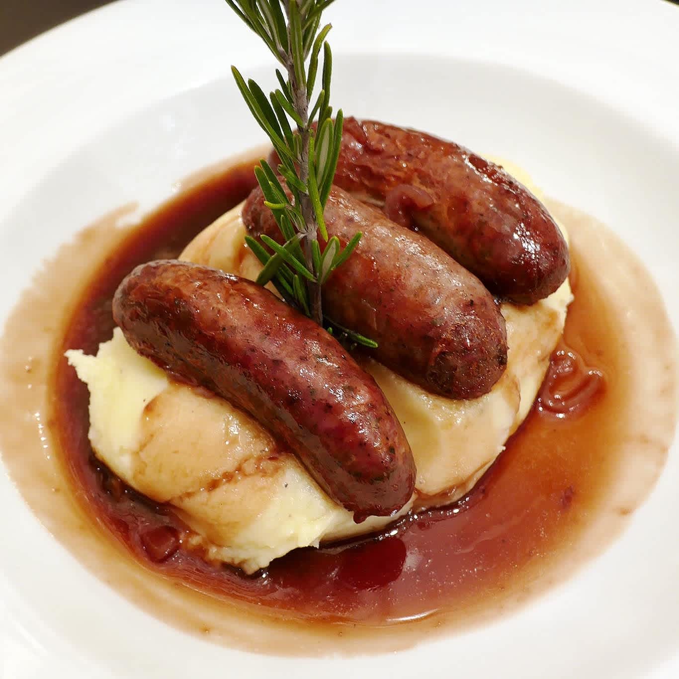 Bangers and mash is quite simply sausage and mashed potatoes. The bangers can be any sort of meat, and oftentimes, the dish is served with gravy.