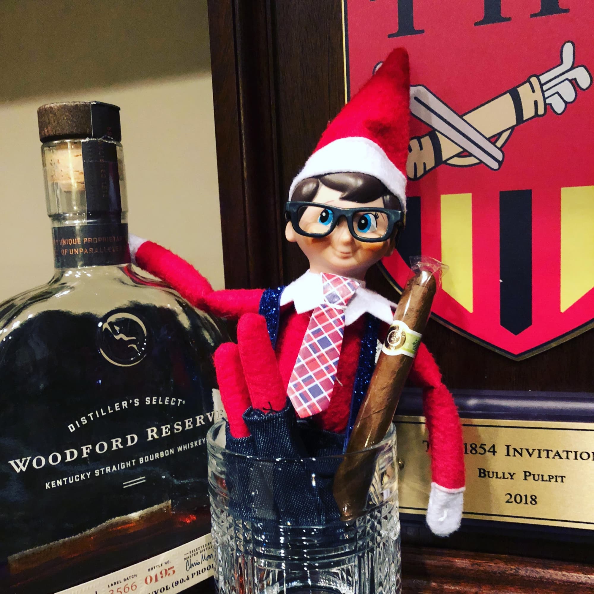 I have learned that a great way to make this activity more interesting is to compete with my husband on creativity. Most especially after a few cocktails, Carl can really get into some good fun. Sometimes Carl and Batgirl have a rendezvous in the hot tub (aka bathroom sink) or Spider-Man hangs Carl from the ceiling fan with his web. Or my best one to date, when Carl dressed up as Daddy in glasses and a tie and sat himself in a rocks glass with bourbon and a cigar (see above). And that is what this Elf on the Shelf is all about – fun!