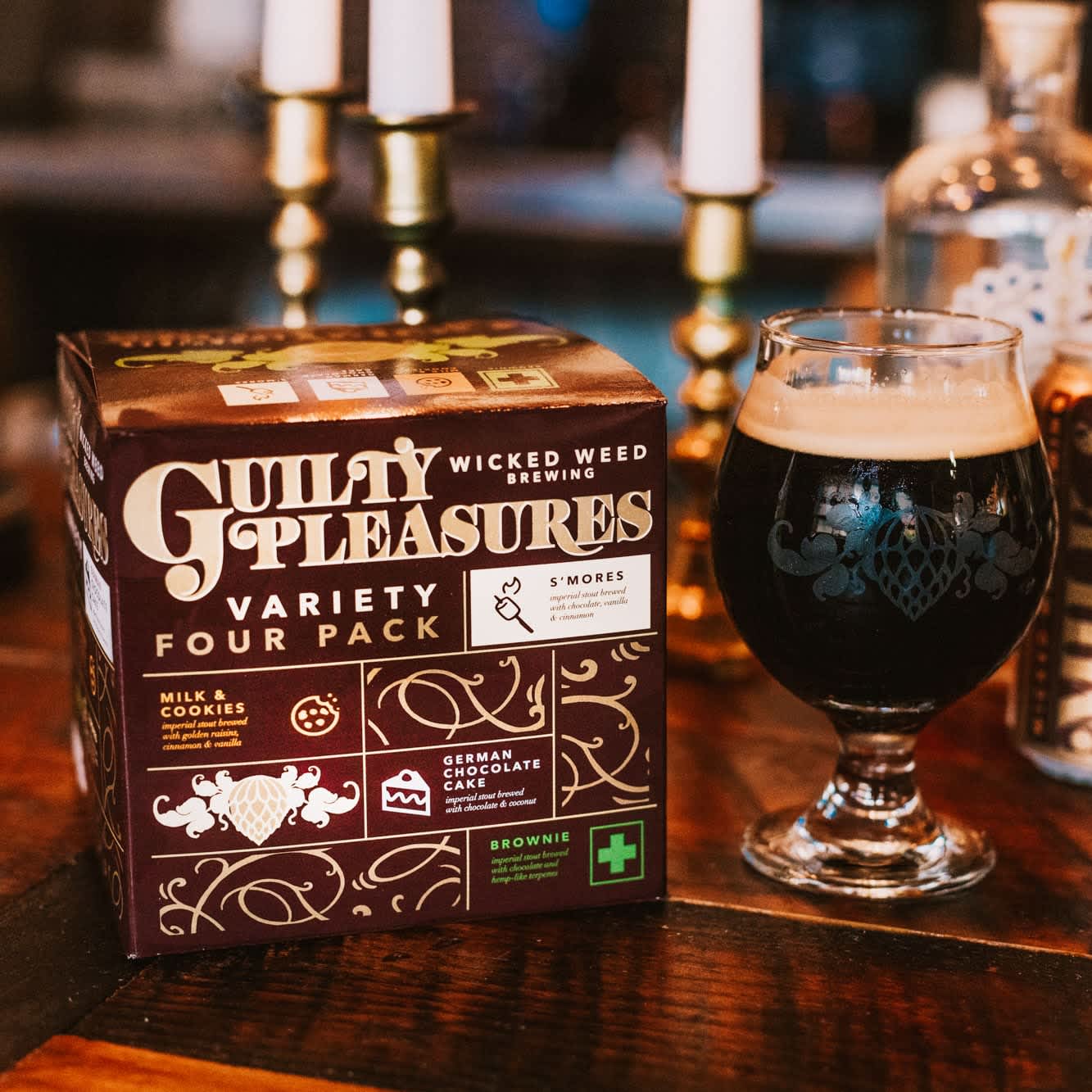 The variety pack of imperial stout, appropriately branded Guilty Pleasures, includes flavors like brownies, s’mores, German chocolate cake, and milk and cookies. Um, yum! While bold flavors can sometimes compromise the integrity of a beer by overpowering the natural taste of it, that is fortunately not the case for these high-quality imperial stouts. So don’t worry about it tasting artificial or overly sweet, because the Guilty Pleasures variety pack is truly the perfect balance of decadent desserts and imperial stout. Keep reading to see the specific flavors now, and use Wicked Weed Brewing’s online beer finder to see where you can purchase the four-pack for yourself.